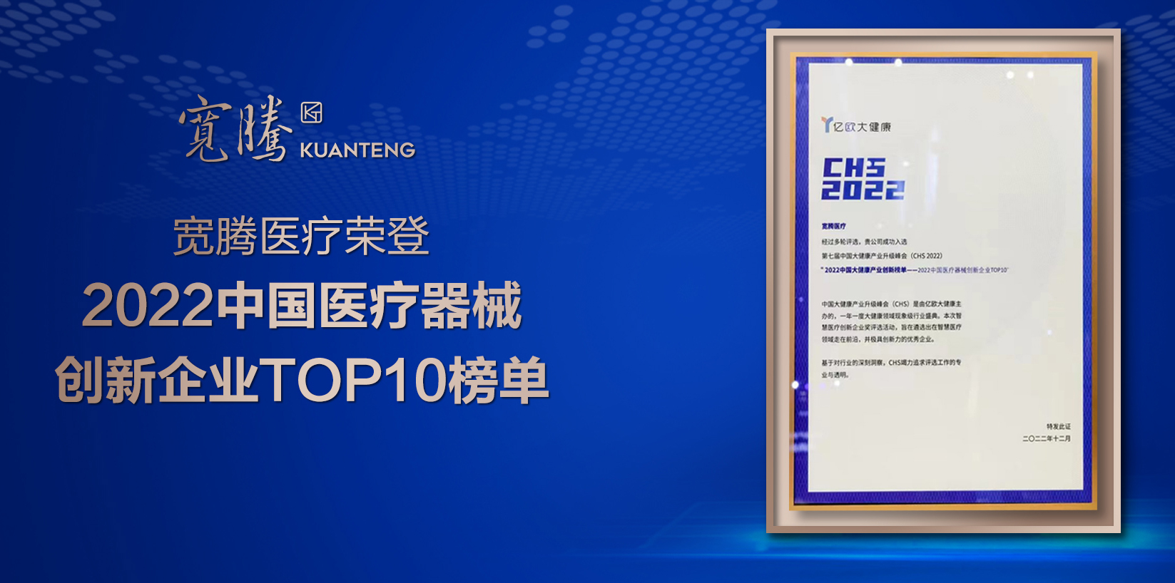 Kuantang Medical was listed in the "Top 10 Chinese medical device innovation enterprises in 2022" list